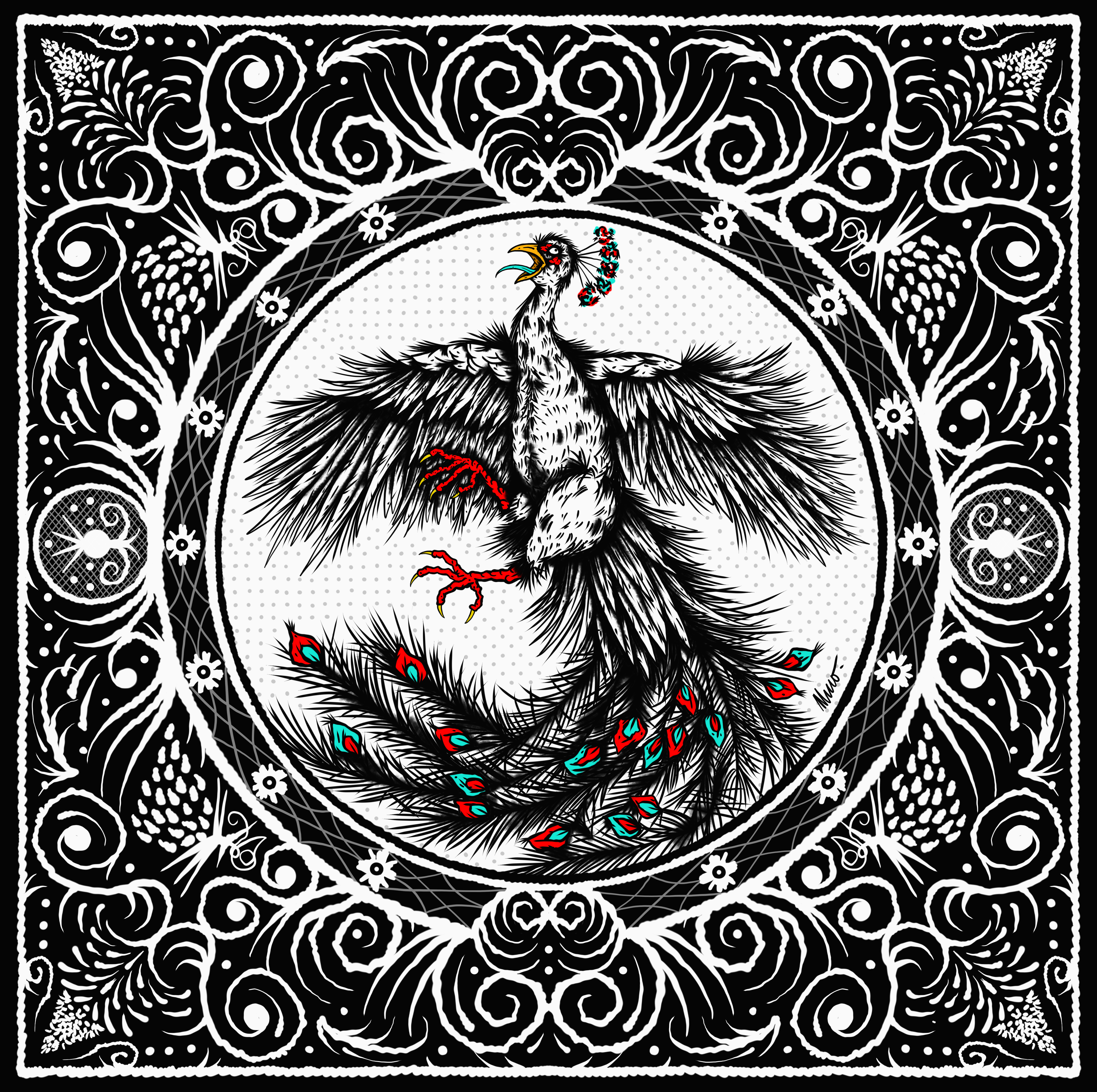 Impresionante plumaje negro y blanco que se extiende a través de un elaborado marco ornamental. El ave central, con sus colores vibrantes y expresión vigorosa, evoca un sentido de poder y misticismo dentro de la composición intrincada. Esta obra cautiva con su fusión de elementos simbólicos y técnica gráfica exquisita, creando una pieza que destaca por su fuerza visual y narrativa sugestiva.