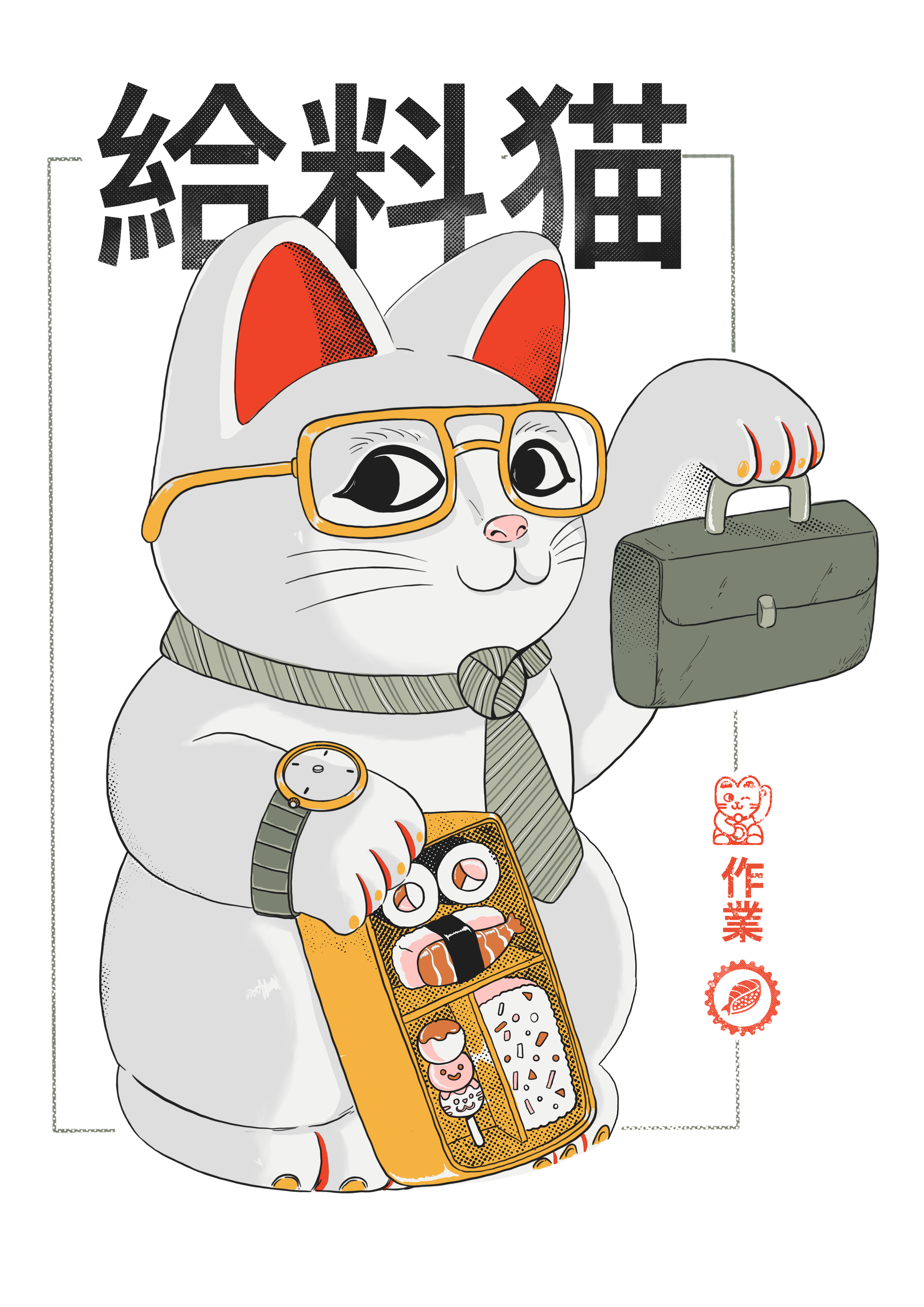 El kanji dice: “gato asalariado y adicto al trabajo”.